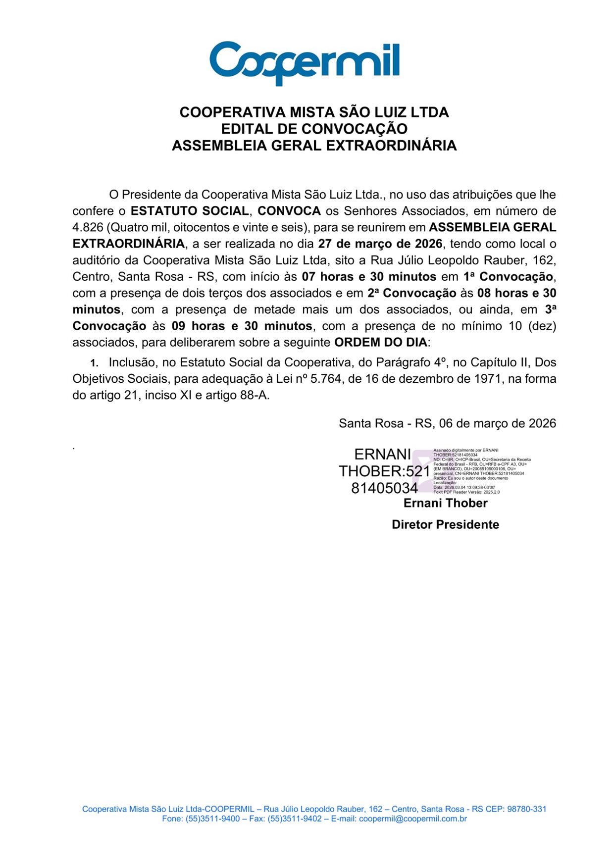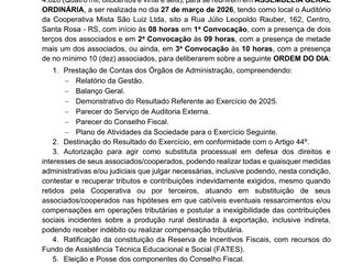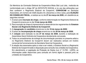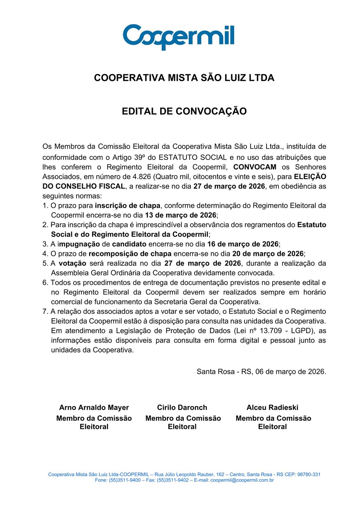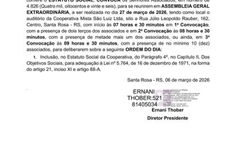 sexta-feira, 6 de março de 2026 COOPERMIL PUBLICA EDITAIS DE A.G.O., A.G.E. E ELEIÇÃO DO CONSELHO FISCAL A Coopermil publica seus editais de convocação apra Assembleia Geral Ordinária, Assembleia Geral Extraordinária e Eleição do conselho Fiscal. ← Voltar